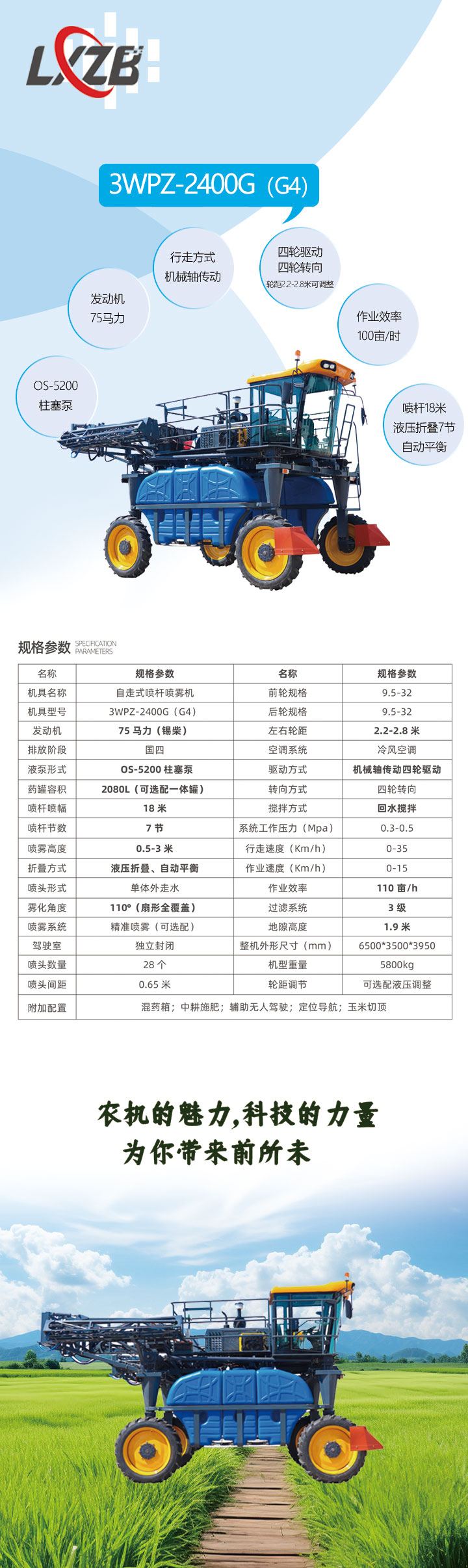3WPZ-2400G(G4)自走式噴桿噴霧機是一種集噴藥,切頂,施肥等功能于一體的噴藥設備此機型采用錫柴國四排放標準75馬力發動機,0S-5200柱塞泵,配備全封閉獨立駕駛室。該機型行走方式采用機械軸傳動,在泥濘道路中驅動力強,脫困能力強,適合多地形作業;四輪驅動四輪轉向,輪距2.2米-2.8米可調整(可選配液壓調節輪距》,設計結構合理,維修便捷,作業質量好,作業效率可達每小時100畝。