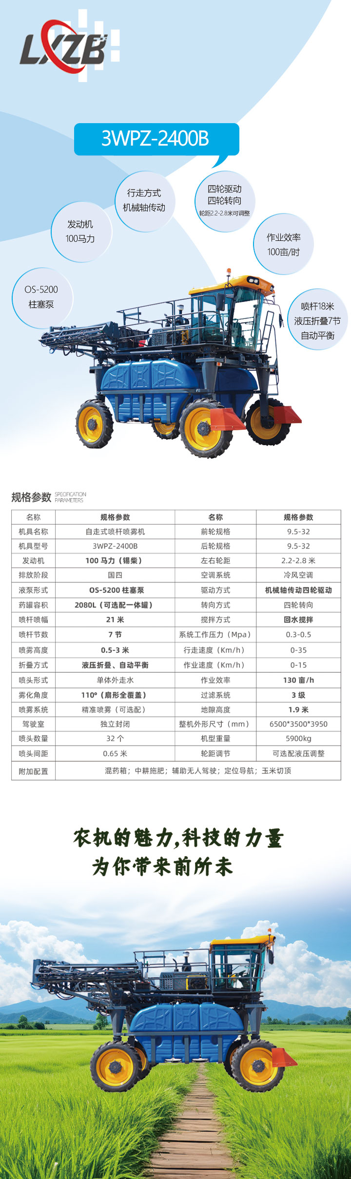 3WPZ-2400B自走式噴桿噴霧機是一種集噴藥,切頂,施肥等功能于一體的噴藥設備此機型采用錫柴國四排放標準發動機100馬力,配備全封閉獨立駕駛室,0S-5200柱塞泵,4+1共五個擋位4個前進擋位一個后退擋位。該機型行走方式采用機械軸傳動這款傳動方式在泥濘道路中驅動力強,脫因能力強,輪距2米-2.6米可調節(可選配液調節輪距》四輪驅動四輪轉向,輪距可調整,設計結構合理,維修便捷,作業質量好,作業效率可達每小時120畝。各性能指標均超過國家有關標準要求。