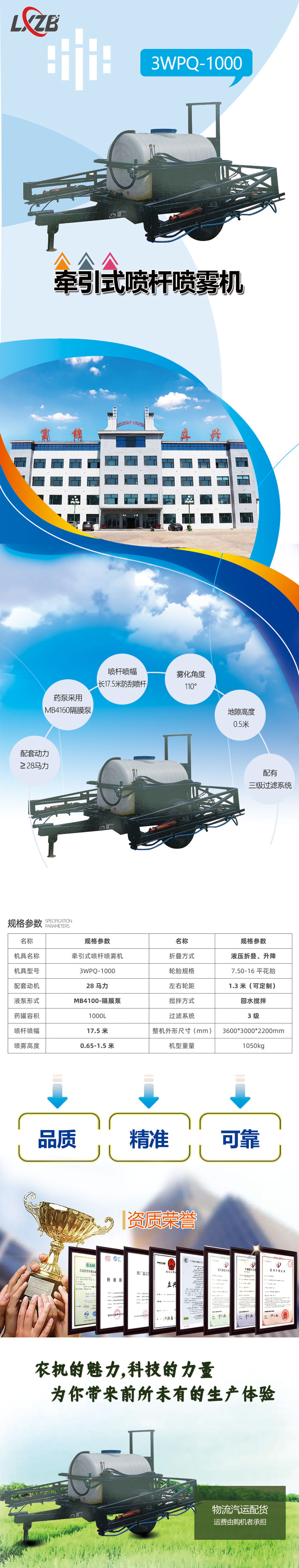 3WPO-1000牽引式噴桿噴霧機,配套動力228馬力,藥泵采用MB4160隔膜泵,配有三級過濾系統,回水攪拌功能,藥箱容積1000L,噴桿噴幅長17.5米防刮噴桿,噴霧高度0.65-1.5米,霧化角度110°,噴桿液壓折疊、升降,左右輪距1.3米(可定制),地隙高度0.5米,適合小馬力機型牽引車頭,小地塊作業噴灑需求。