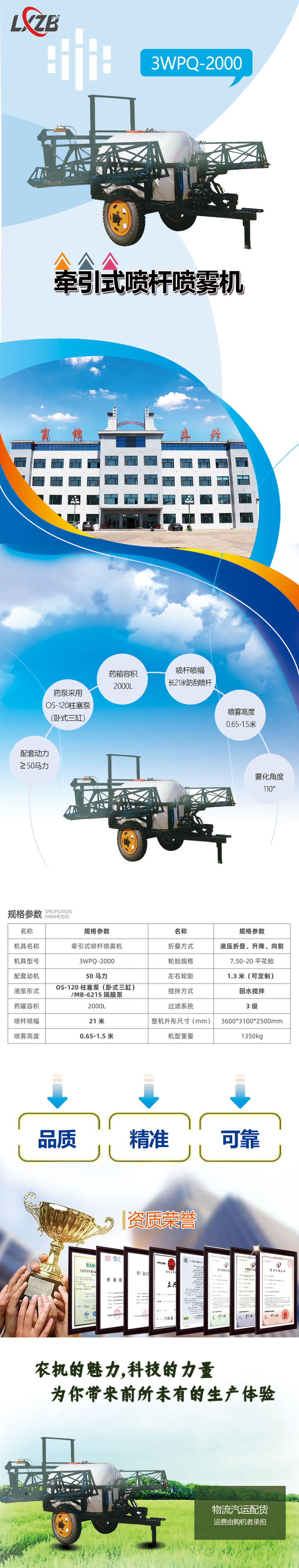 3WPO-2000牽引式噴桿噴霧機,配套動力250馬力,藥泵采用0S-120柱塞泵(臥式三缸)或MB-6215隔膜泵,配有三級過濾系統(tǒng),回水攪拌功能,藥箱容積2000L,噴桿噴幅長21米防刮噴桿,噴零高度0,65-1.5米,零化角度110°,噴桿液壓折疊、升降,左右輪距1.3米(可定制》,地隙高度0.5米,適合小馬力機型牽引車頭,中小型地塊噴灑作業(yè)需求。