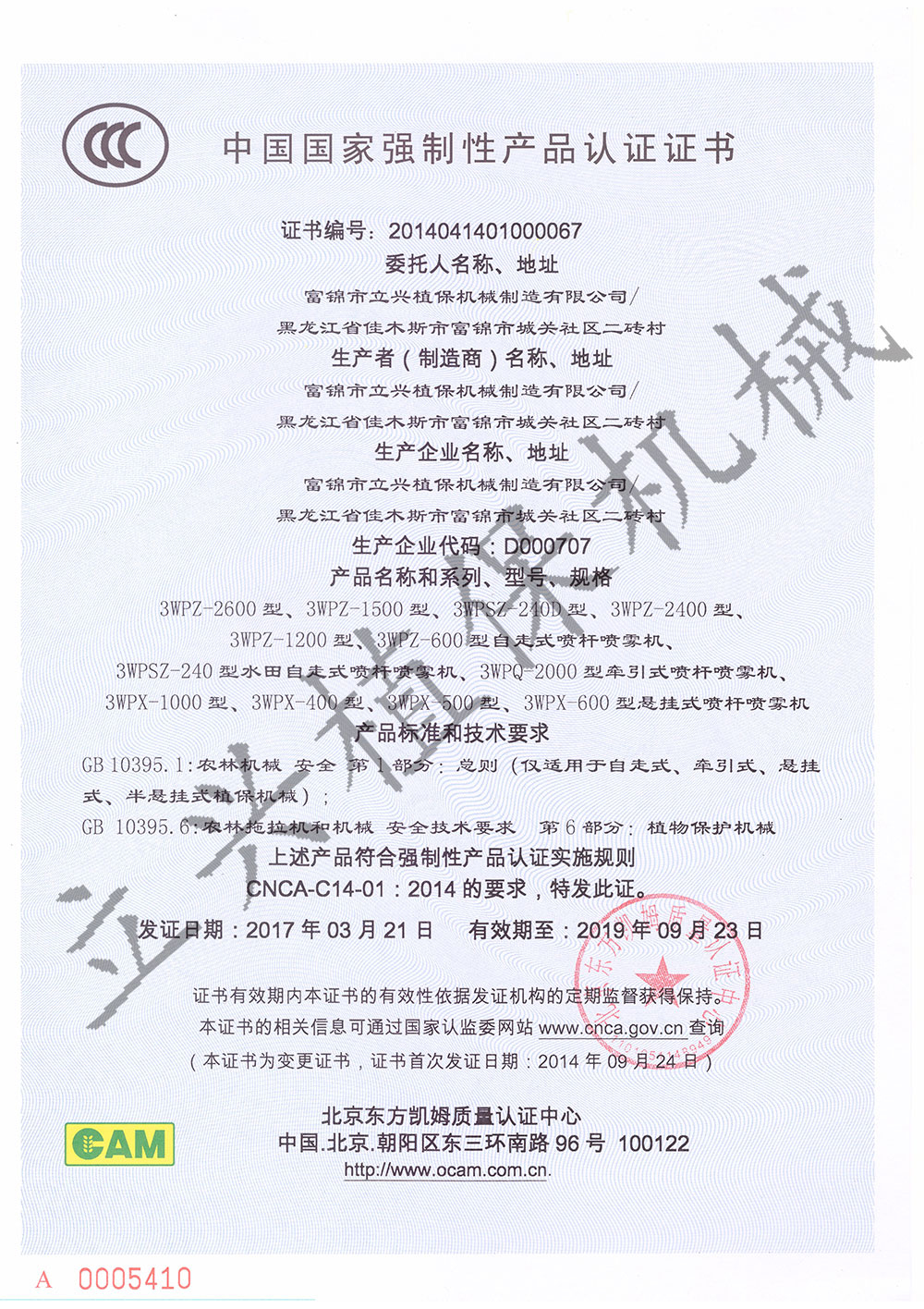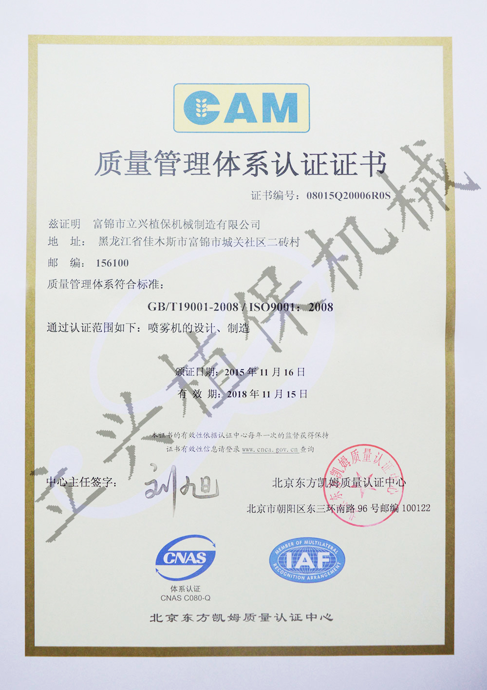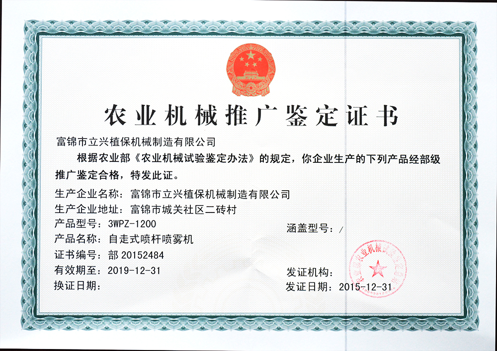 富錦市立興植保機械制造有限公司,成立于2005年,位于黑龍江省富錦市工業園區,是專業研發、生產及銷售的植保機械制造企業。企業發展的行業屬于國家重點支持的新興戰略產業,已擁有"立興"等注冊商標,公司通過了ISO9001質量管理體系認證、CCC國家強制性產品認證和農業部農業機械推廣鑒定認證,并獲得了相關資質證書,其中五種機型3WPZ-2400、3WPZ-1200、3WPZ-600、3WPQ-2000、3WPX-1000已進入國家補貼目錄,并在各省、自治區及農墾兵團農機推廣目錄中歸檔銷售,用戶購買我公司產品就可以享受國家補貼政策。