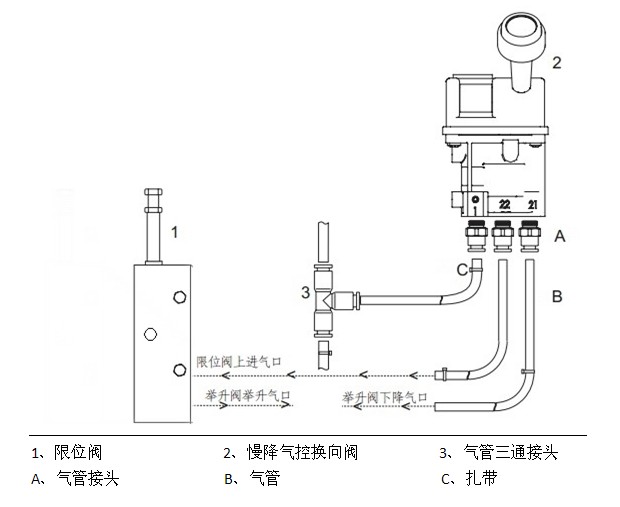 1、慢降組合控制氣閥安裝到駕駛座椅旁邊,安裝支撐架必須結(jié)實(shí)牢固。